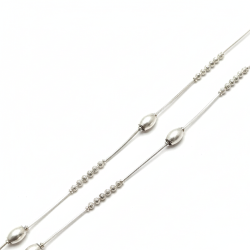 Our sterling silver anklets offer unparalleled comfort and artistry. Crafted from high-quality silver, the slim, high-polish snake chain ensures a smooth and sleek fit around your ankle. The mixed-texture design incorporates rhythmic stations of alternating beads that create a stunning visual effect. Featuring satin-finish ovals with a soft matte luster and diamond-cut rondelles that sparkle effortlessly, these anklets exude refined beauty.