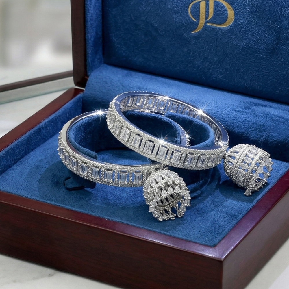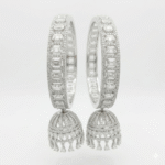Whether you’re a bride seeking statement jewelry or attending high-fashion ethnic events, the Baguette-Cut Diamond Jhumka Bangles ensure you stand out in luxury festive gatherings. Their polished white-gold or silver finish aligns flawlessly with any celebratory outfit, making them the ideal accessory for those who appreciate the finer things in life.