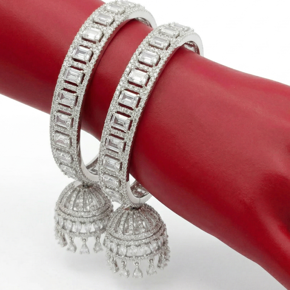 Experience the perfect fusion of contemporary allure and heritage charm with our Baguette-Cut Diamond Jhumka Bangles. These exquisite silver-toned bangles are thoughtfully designed to bring together sleek geometry and graceful movement, making them a standout accessory for any special occasion.
