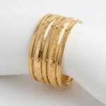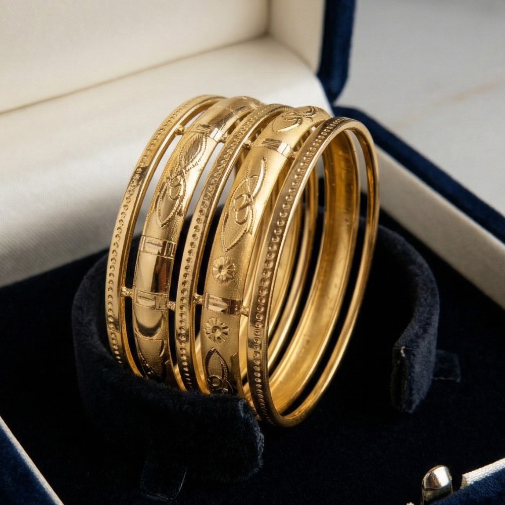 Every detail is designed to impress—from mirror-polish bands to soft-matte textured engravings and delicate beaded edges (Rava). With their grand “Kada-style” appearance and rich yellow gold finish, these statement pieces embody royal aesthetics that complement bridal trousseaus and festive wardrobes alike.