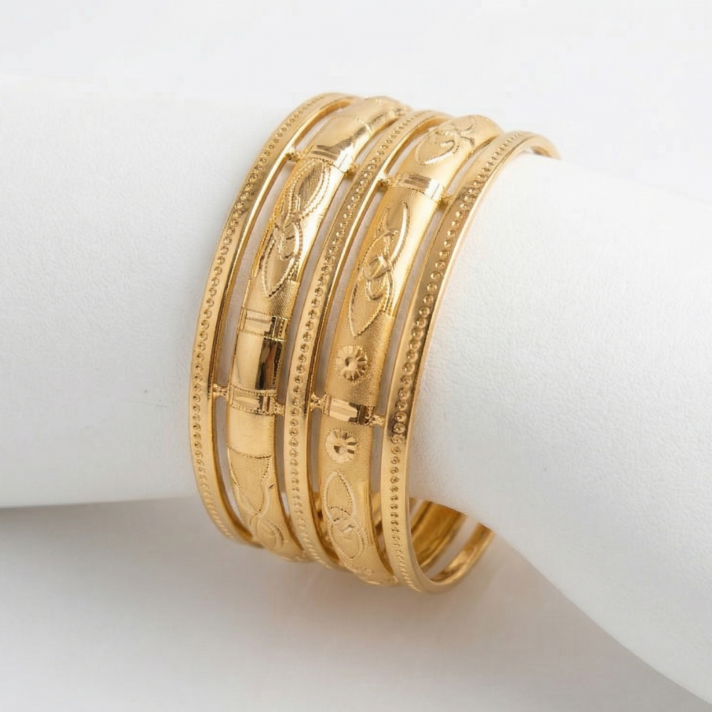Crafted with precision, these bangles showcase tiered lattice structures made from connected gold pillars. The two domed central bands highlight elegant floral vines and petal motifs, emphasizing timeless craftsmanship and natural elegance.
