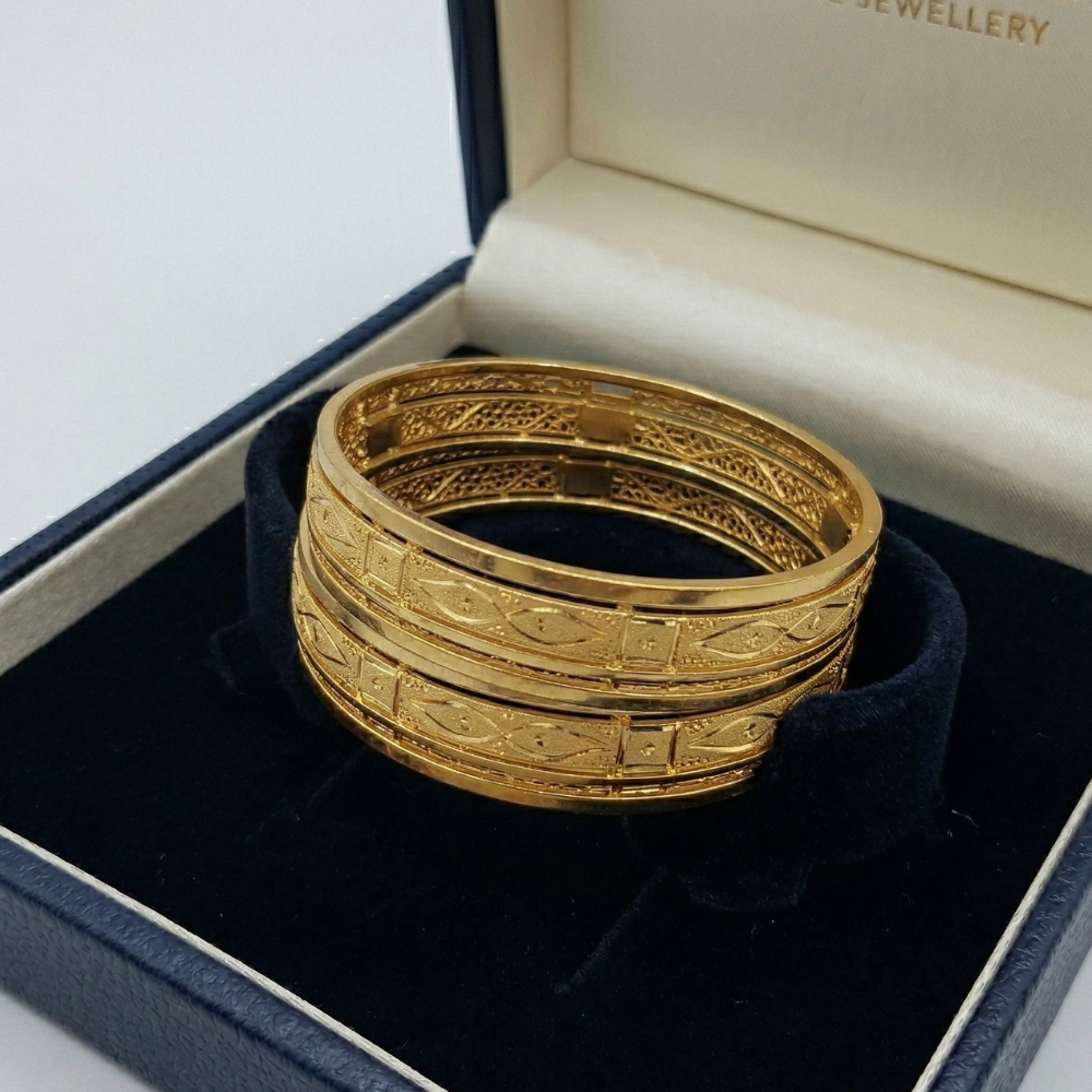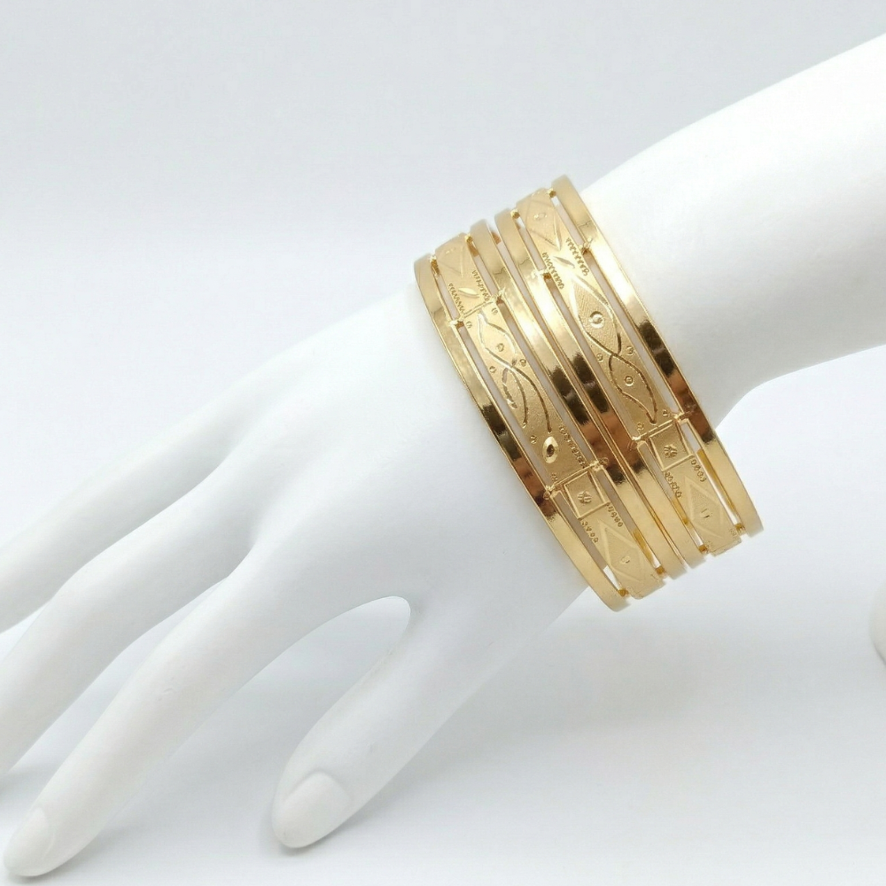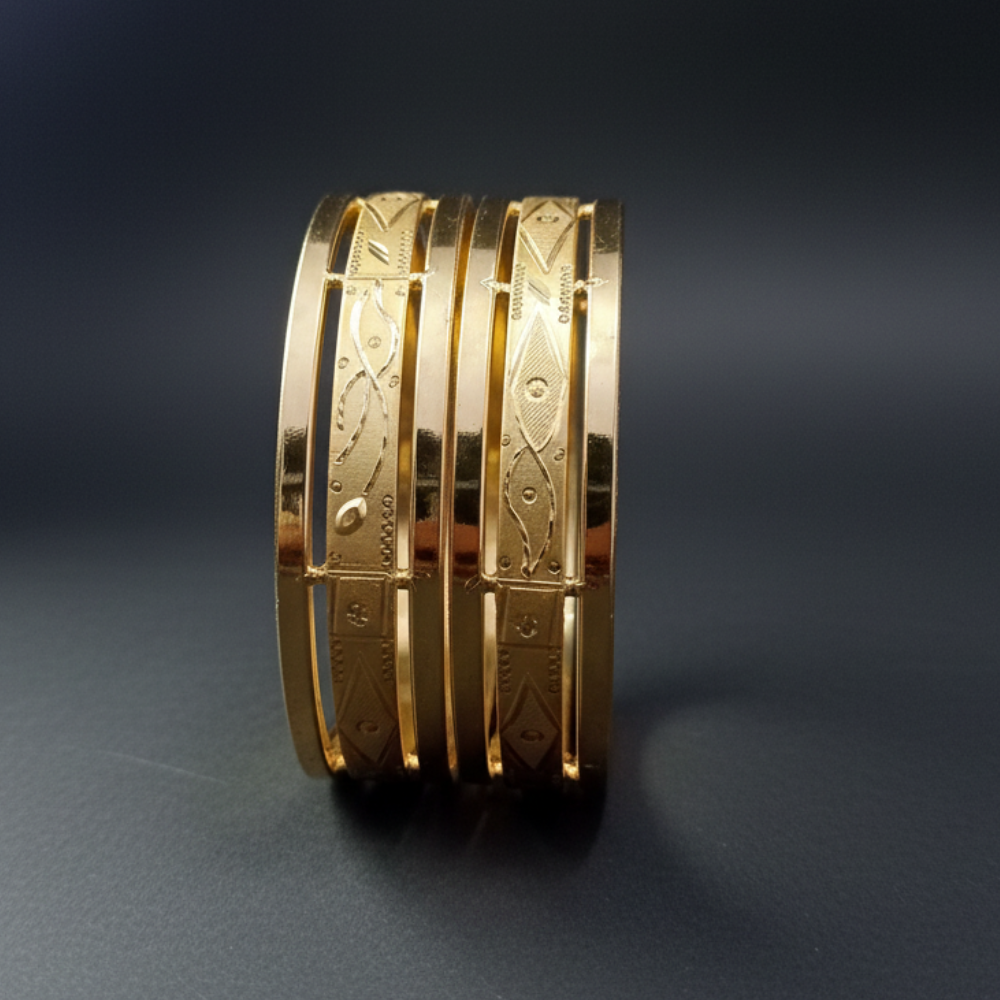 Crafted with a bold yet lightweight cage silhouette, these bangles feature four interconnected bands joined by sturdy gold pillars. This structured design ensures durability while delivering an airy, sophisticated look that complements both casual and formal outfits.
