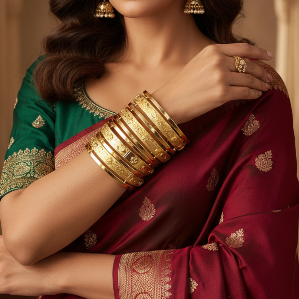 Meticulously detailed with diamond-cut borders, frosted matte finishes, and high-polish mirror bands, these bangles catch the light beautifully from every angle. The bold “Kada-style” width paired with the rich yellow gold finish makes them a versatile statement piece—ideal for bridal trousseaus, festive celebrations, or high-end gifting.