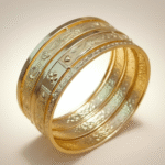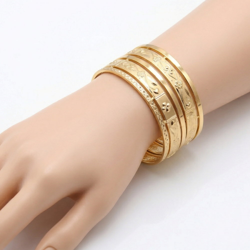 At the heart of its design are embossed panels featuring symbolic motifs: four-leaf clovers for luck, dainty hearts for love, and floral vines for grace. These thoughtful details make the bangles a meaningful accessory for special occasions.