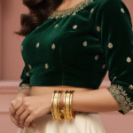 Exquisite Bead Detailing: A central row of gold beads (Rava work) offers a handcrafted touch and adds depth to the design’s intricacy.