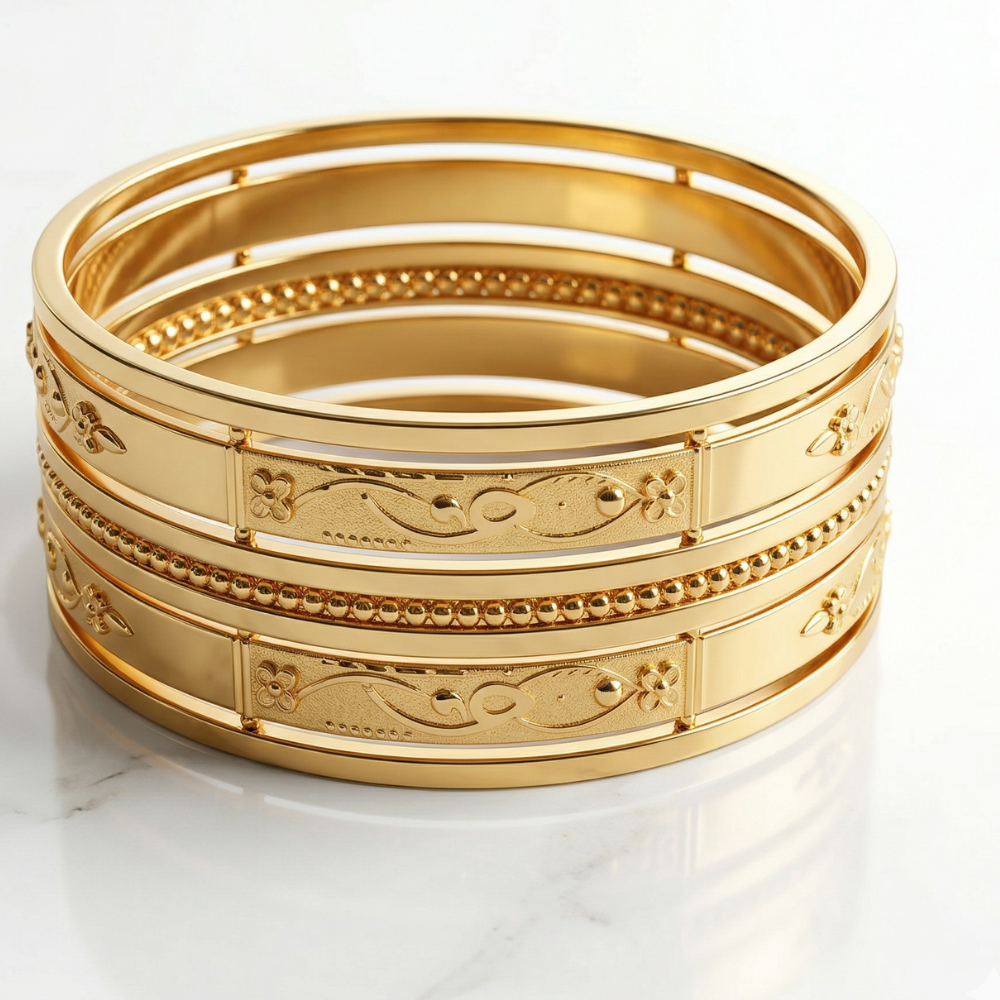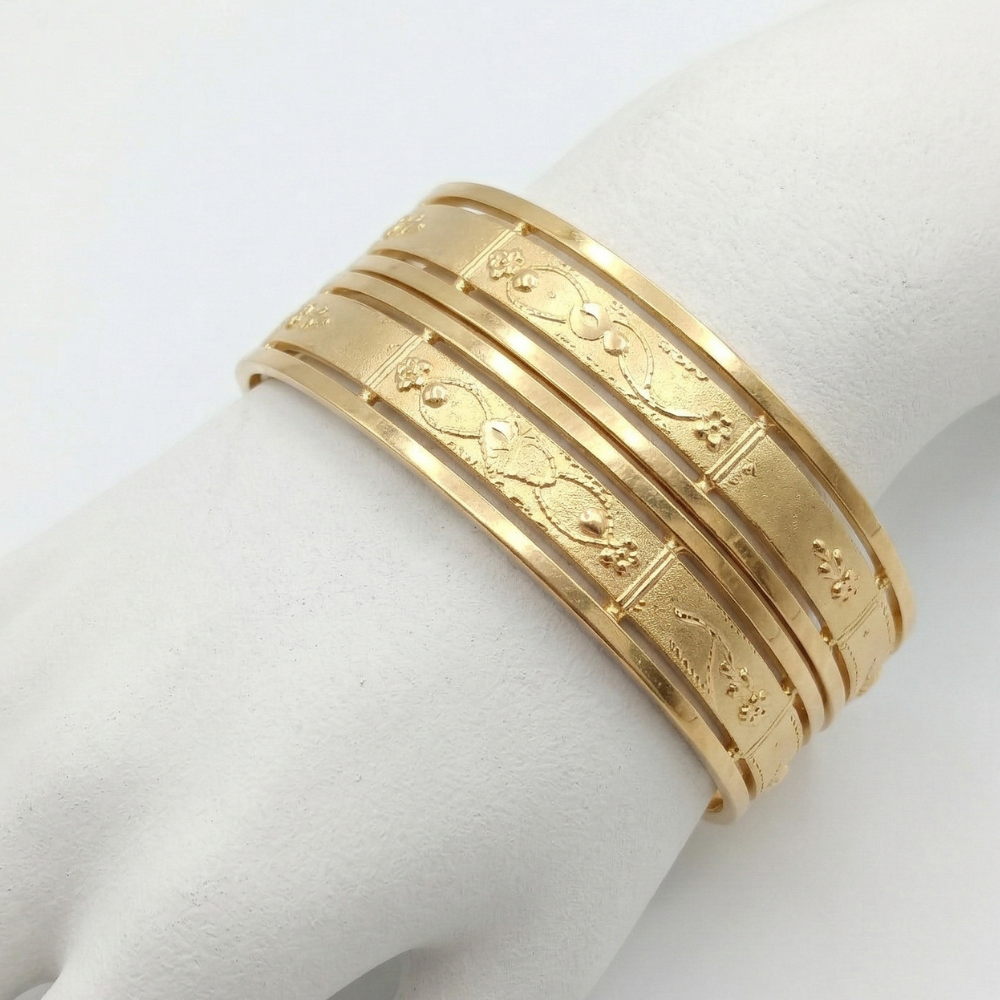 Finished in lustrous yellow gold and blending mirror-finish with frosted textures, these bangles make an unparalleled accessory for showcasing premium taste. Perfect for any celebration, they embody luxury that complements your unique style.