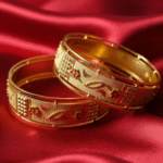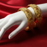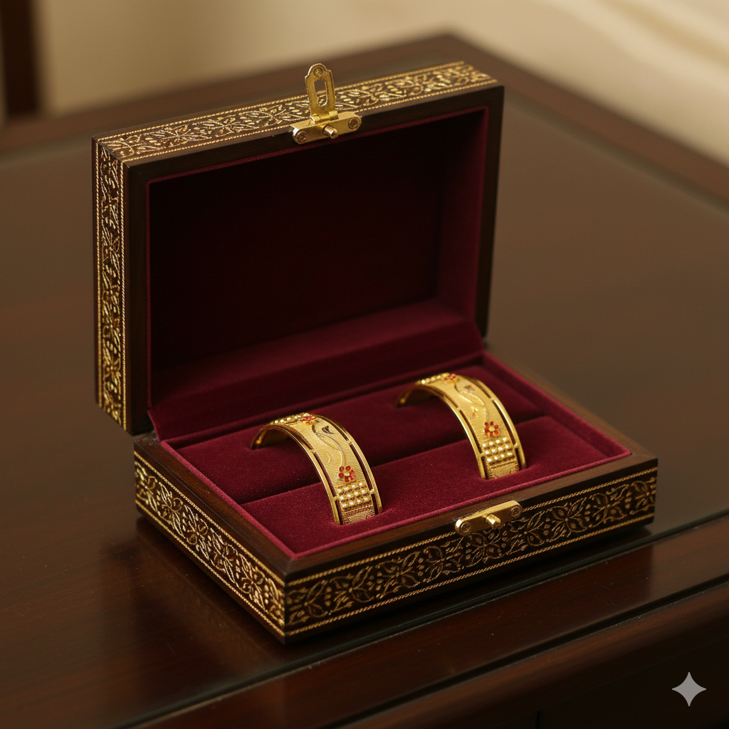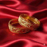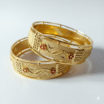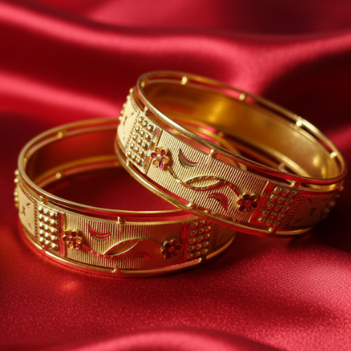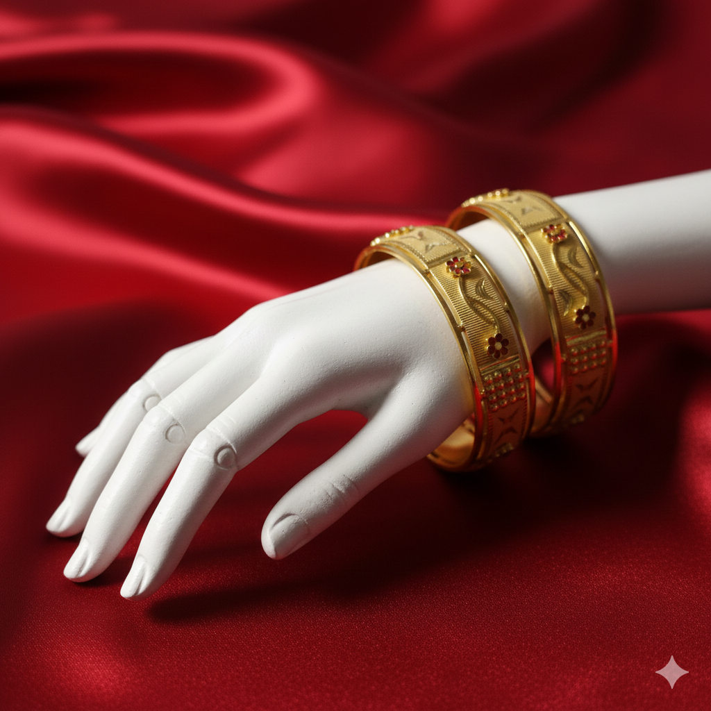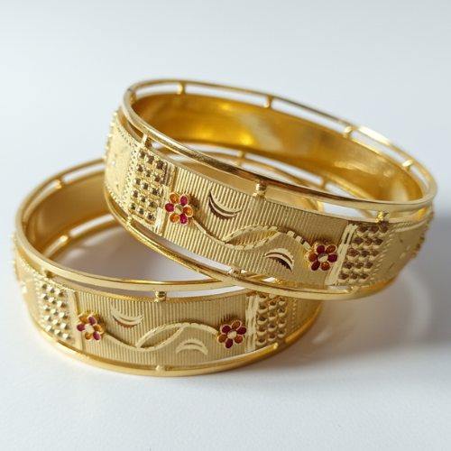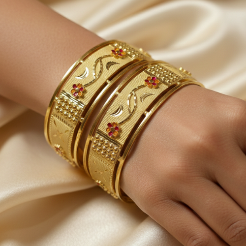 The detailed craftsmanship sets these bangles apart from ordinary jewelry pieces. Each bangle showcases fine engraving that beautifully complements the delicate floral motifs adorned with small red stone accents, making them a truly standout accessory. The harmonious blend of design elements ensures they pair exceptionally well with sarees, lehengas, or any traditional outfit you choose to wear.