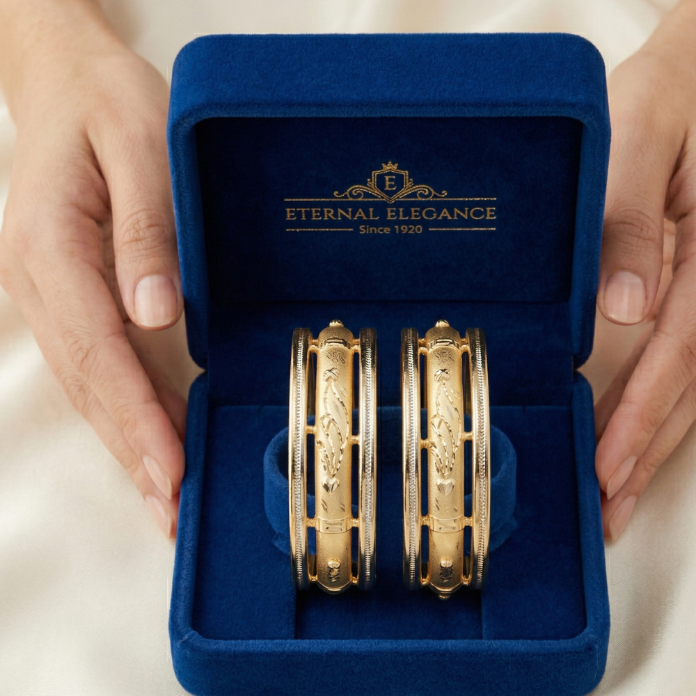 Discover the Gold Architectural Lattice Bangles, a fusion of bold modernity and intricate Indian craftsmanship. These exquisite pieces are designed to make a statement while offering unmatched comfort and lightness on the wrist.