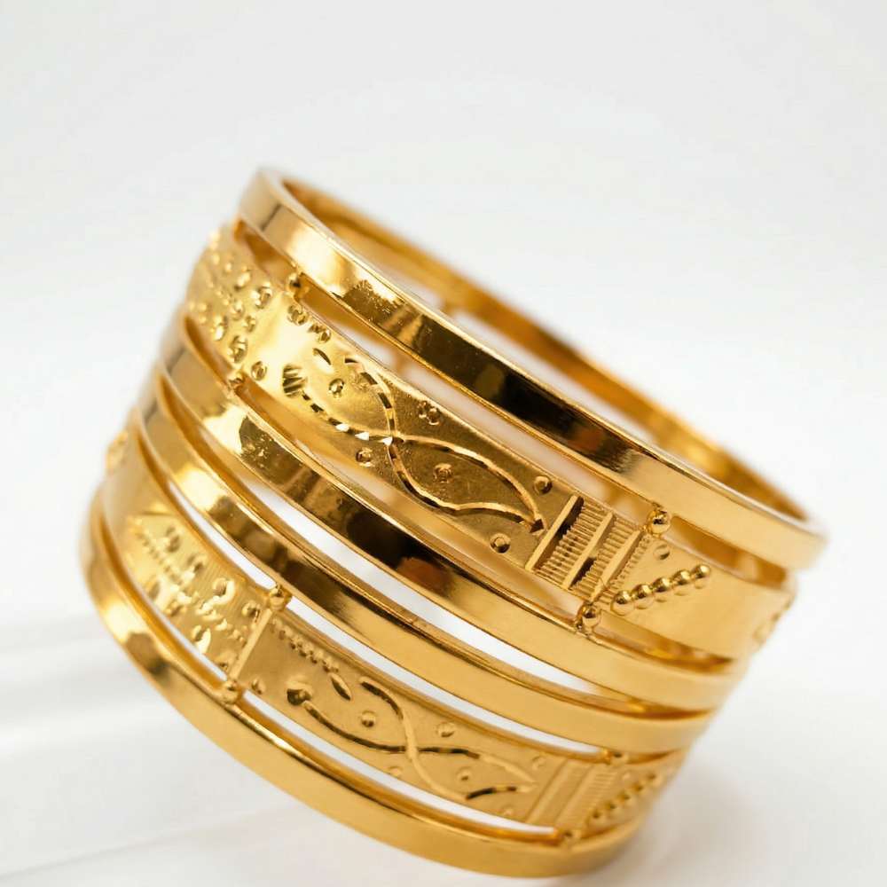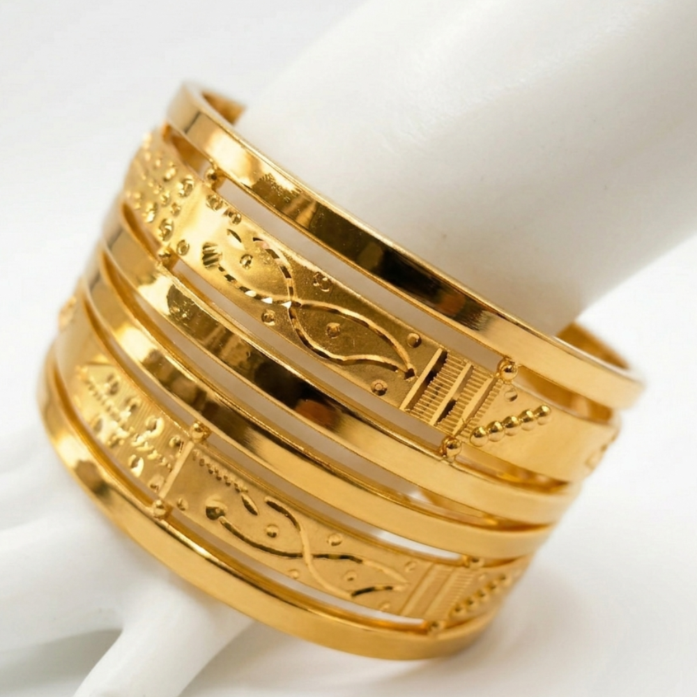 Designed with a wide, “Kada-like” presence and enriched with the luxurious luster of 22k yellow gold, these bangles are ideal for bridal trousseaus and festive celebrations. Their royal aesthetic effortlessly elevates any look, making them a treasured addition to your jewelry collection.