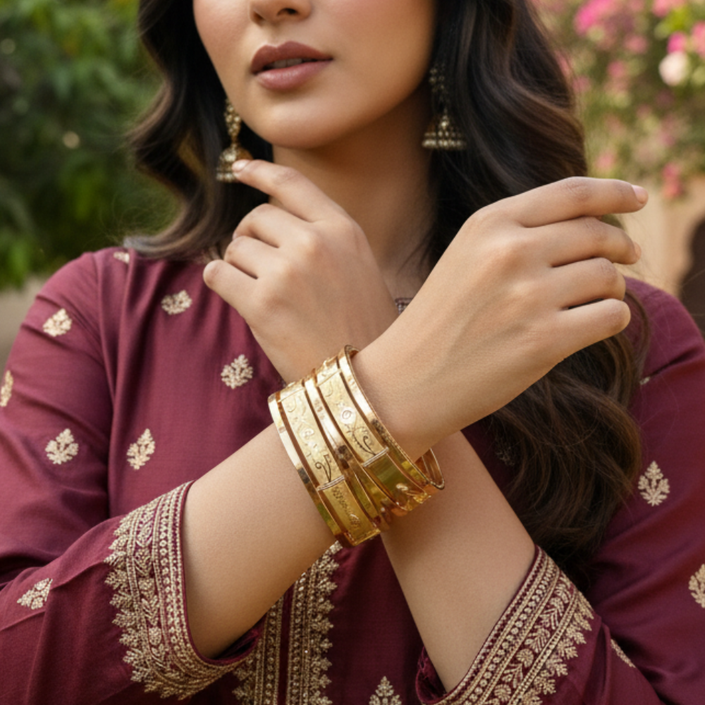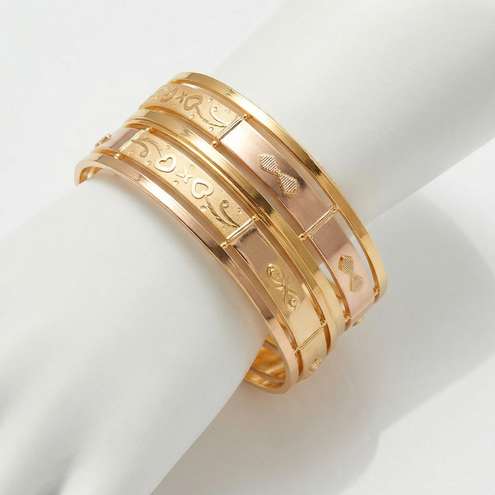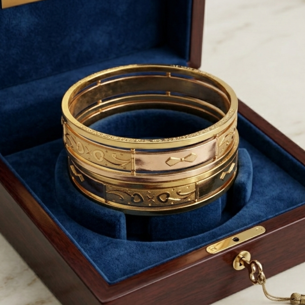 Elevate your jewelry collection with these exquisite 22k Gold Heart & Bow Lattice Bangles, a luxurious blend of modern structural beauty and classic romantic motifs. Crafted with precision, they promise to make an impactful style statement at any celebration or occasion.