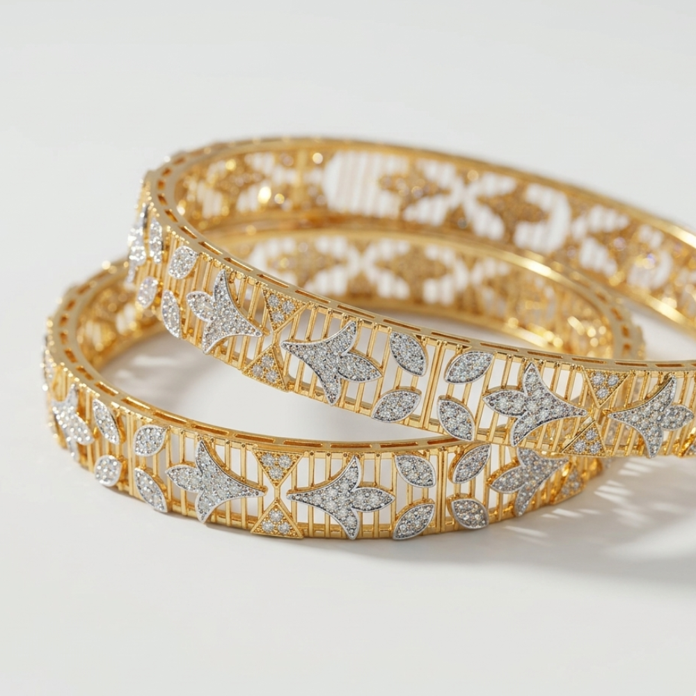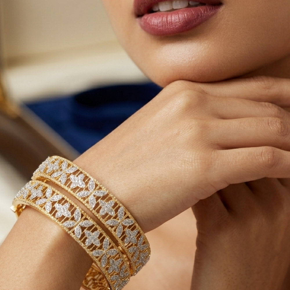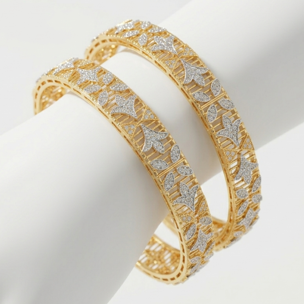 Crafted with precision, these bangles showcase elegant floral-inspired designs complemented by modern geometric elements. The warm gold plating forms a perfect backdrop to the brilliant white stones, creating a striking contrast that stands out effortlessly. The structured open-work design lends these pieces a unique touch of sophistication.