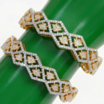 The bangles boast interlocking diamond-shaped frames that are pavé-set with shimmering, brilliant-cut white stones. Each cell is enriched with intricate open-work “jaali” detailing, adding depth and a touch of sophistication to the overall look. This piece is an embodiment of luxe design and meticulous artistry.