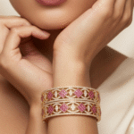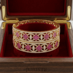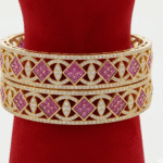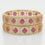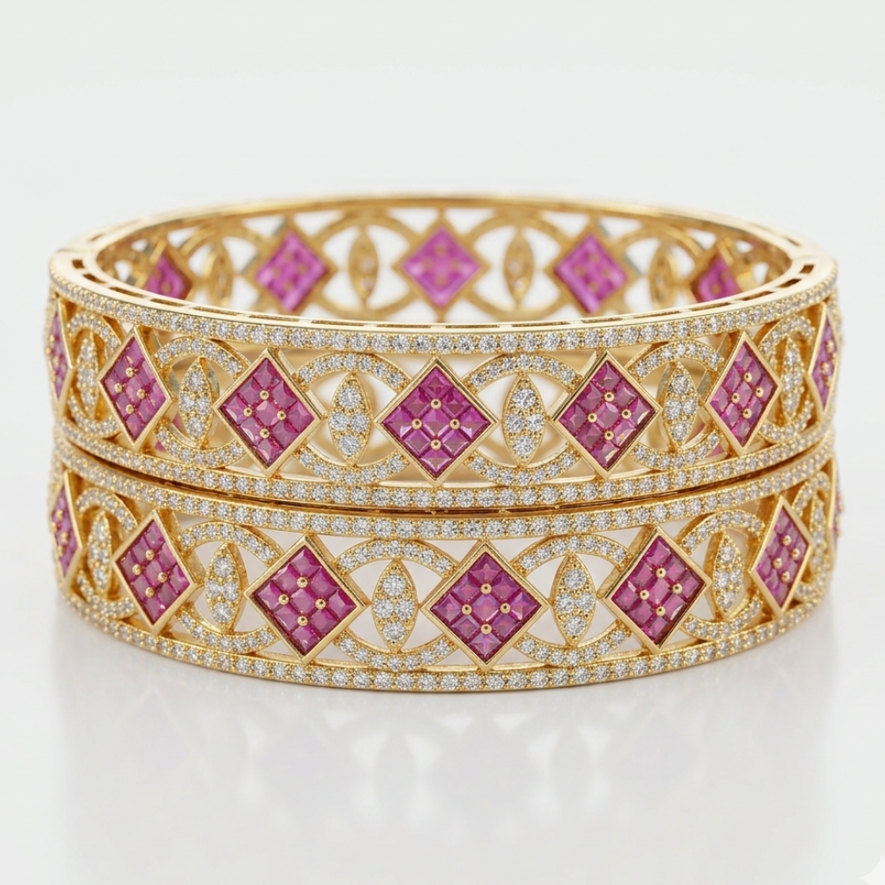Featuring a wide-band silhouette embellished with repeating ruby diamond motifs, these bangles boast intricate circular gold cut-outs. The centerpiece is precision-filled with deep pink-ruby square clusters, bordered by brilliant white pavé accents that shimmer with every glance—an orchestrated symphony of luxury.