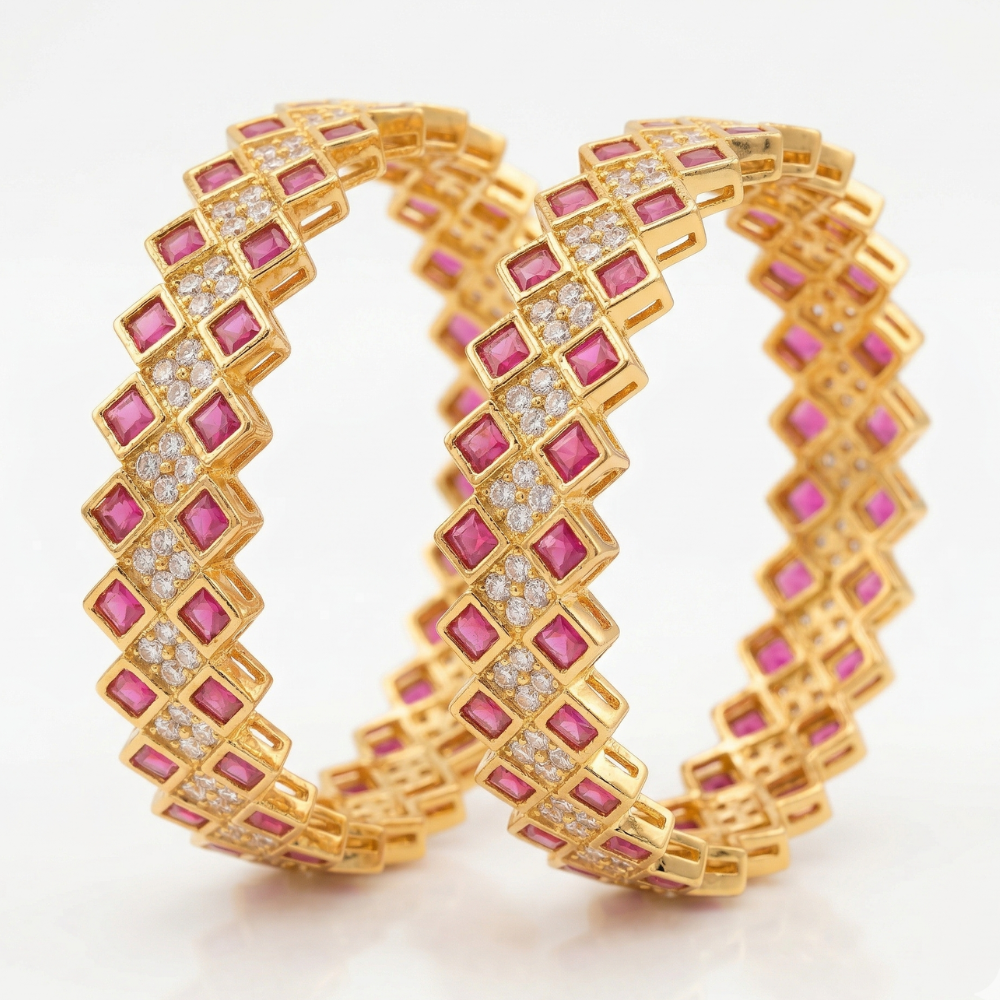 Elevate your jewelry collection with the Vibrant Ruby Zig-Zag Gold Bangles—a truly stunning statement piece. This pair of gold-plated bangles seamlessly combines bold geometric design with intricate craftsmanship, ensuring you stand out on any special occasion.