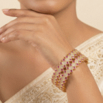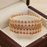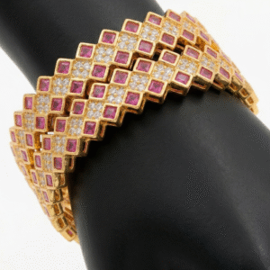 The bangles feature a dynamic zig-zag silhouette with a scalloped edge, enhanced by a repeating diamond-pattern structure. Radiant pink ruby stones, thoughtfully square-cut for brilliance, alternate with clusters of dazzling white pavé stones. This unique layout beautifully balances glamour and refinement.