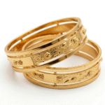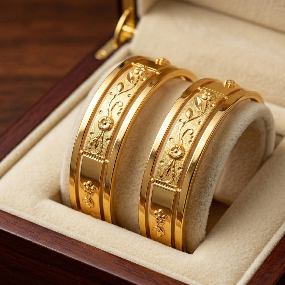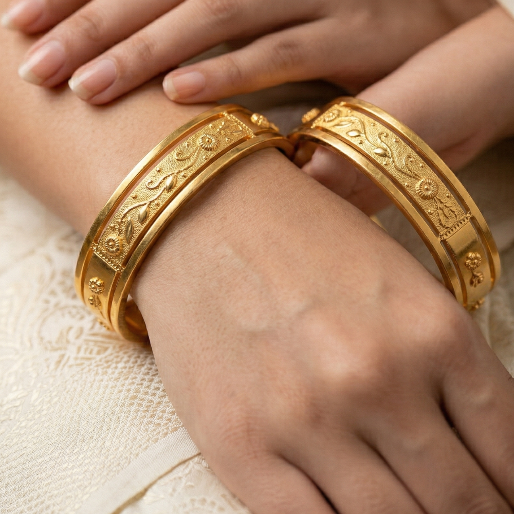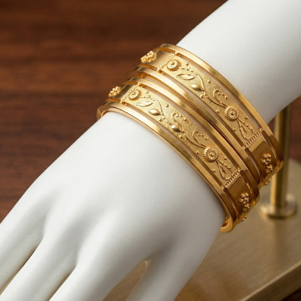 Crafted with precision, these bangles feature a central band adorned with detailed floral and vine motifs. The nature-inspired designs add a subtle yet striking decorative touch that exudes grace.