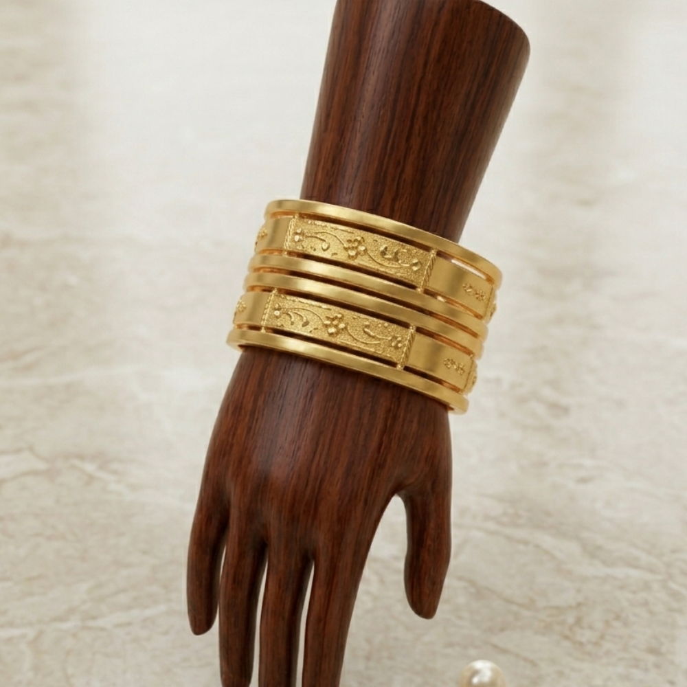 A stunning balance of textures sets these bangles apart. The sandblasted matte finish on the floral center contrasts beautifully with the mirror-polished gold edges, inviting a luxurious visual and tactile experience. Perfect for special occasions such as weddings, anniversaries, or sophisticated festive celebrations, this versatile statement piece is designed to impress.