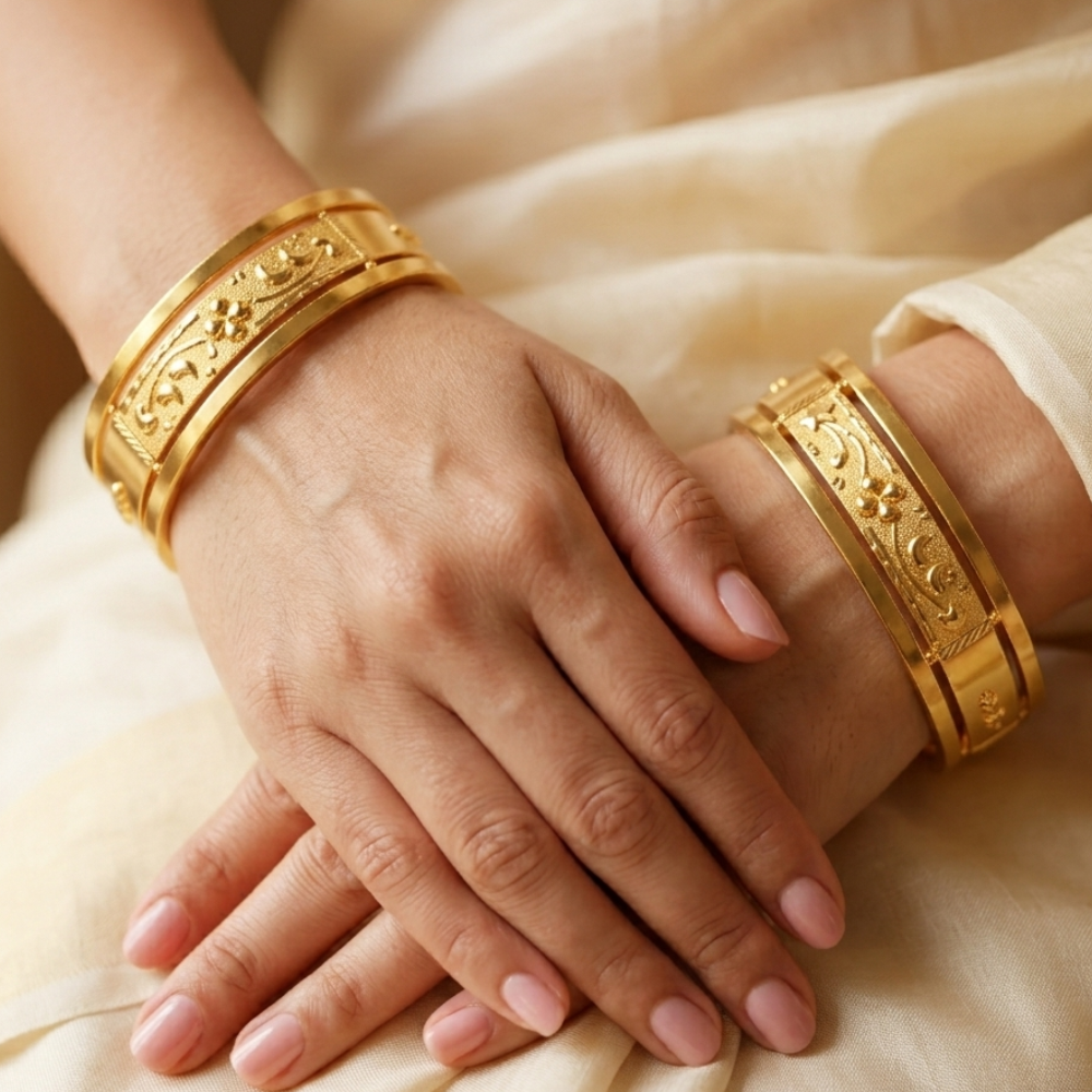This is a stunning pair of  yellow gold bangles, featuring an elegant broad-frame design that perfectly balances traditional charm with modern sophistication.