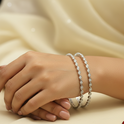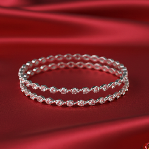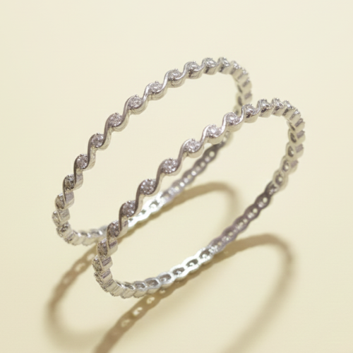 Introducing these stunning silver-toned bangles, thoughtfully designed with a distinct wavy or serpentine pattern that adds a sense of movement and sophistication to your jewelry collection. The continuous curves of these bangles are adorned with shimmering, clear stones—possibly cubic zirconia or dainty diamonds—making them a perfect accessory for enhancing your everyday look or complementing special occasions. These bangles are more than an accessory; they are a piece of wearable artistry.