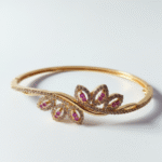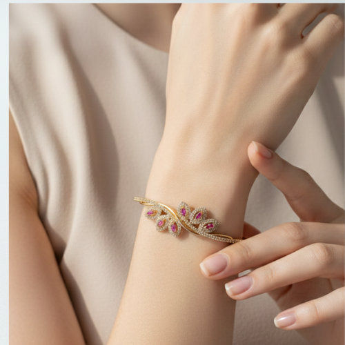 This gold-plated bracelet blends timeless elegance with modern tradition, making it perfect for weddings, festive occasions, formal events, or even elevating everyday wear. Featuring a diamond-studded design, a pink stone centerpiece, and delicate green leaf motifs, it pairs beautifully with sarees, gowns, and contemporary outfits. A stunning statement piece and a perfect gift for someone special or yourself.