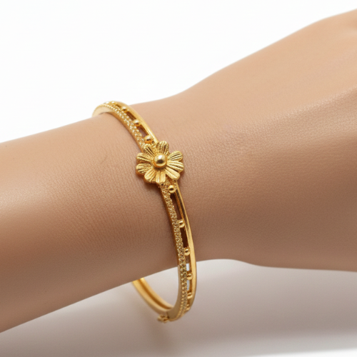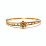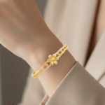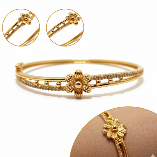 The bracelet’s standout features include a vivid pink stone that captures attention and reflects light beautifully, adding an element of vibrancy. Surrounding the stone are delicate green leaf motifs, intricately crafted to evoke a sense of natural elegance. These unique details transform the bracelet into an artfully designed piece, showcasing exceptional craftsmanship and a harmonious blend of colors that complement the overall design.
