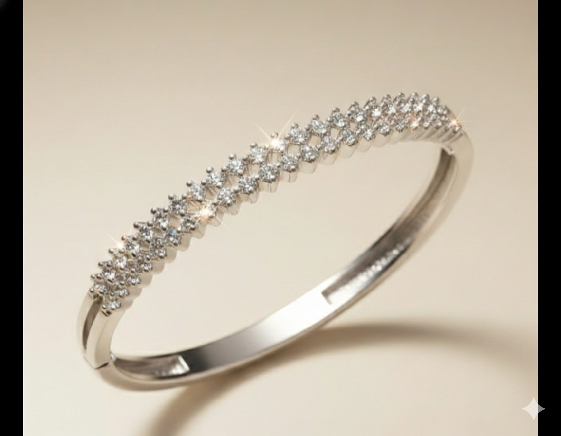 This silver-toned hinged bangle bracelet is the perfect accessory for those who value timeless elegance blended with subtle luxury. Its smooth lower half ensures a sophisticated and minimalist base, contrasting beautifully with the decorative upper half. The top surface is adorned with two parallel rows of small, clear stones, pave set for exceptional brilliance. This creates a highly textured, sparkling band that catches the light effortlessly, making it the ideal addition for both day-to-day glamour and special occasions.