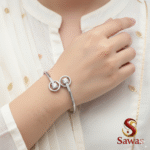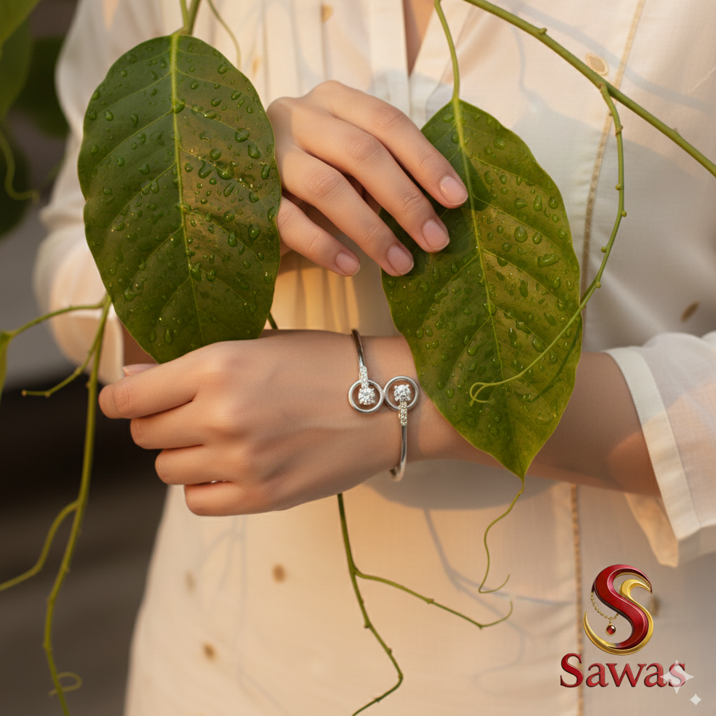Step into sophistication with this elegant silver-toned open cuff bracelet, crafted for those who appreciate artistry in their accessories. Thoughtfully designed, this bracelet features a modern open cuff structure that exudes refinement. It’s enhanced by two prominent round-cut stones, or solitaires, which are cradled within circular settings at the cuff’s opening, offering a perfect blend of traditional glamor and contemporary style.