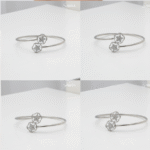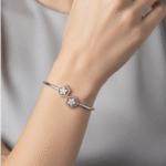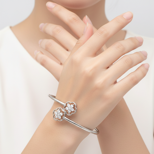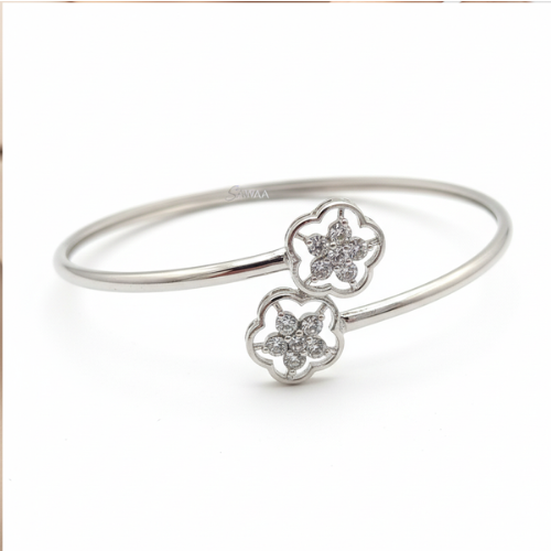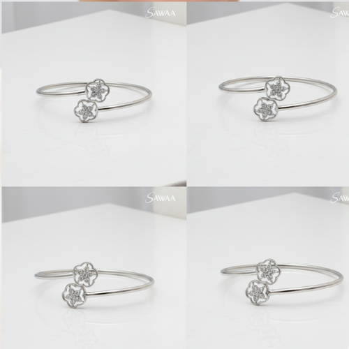 At each end of the cuff, you’ll find two intricately crafted open-work floral motifs. These five-petal flowers are designed with exceptional attention to detail, embodying a subtle nod to nature’s beauty. To enhance its aesthetic appeal, the center of each flower is cluster-set with small, clear stones that sparkle delicately as they catch the light. The floral accents effortlessly combine charm with refinement, making this bracelet a standout piece.