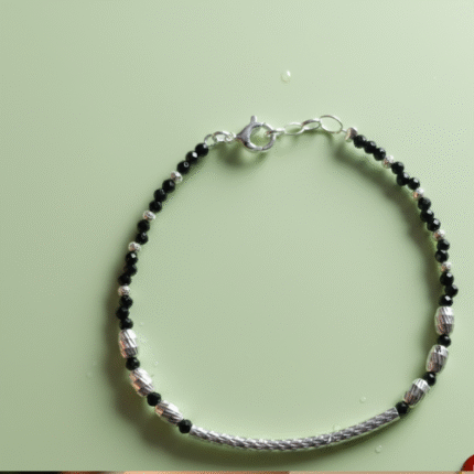 Crafted with the highest attention to detail, this bracelet uses premium materials to ensure durability and comfort. The faceted black beads exude elegance and add subtle sparkle, while the ridged silver barrel beads and the central textured silver tube offer a refined metallic shine. Completed with a secure silver lobster claw clasp, this accessory promises both ease of use and reliability. Whether you’re attending a formal event or simply elevating your everyday outfit, this bracelet makes the perfect fit.