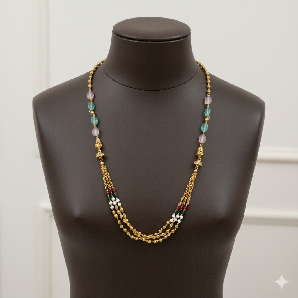 Elevate your style with our stunning multi-layered gold necklace, designed to blend traditional charm with contemporary elegance. Adorned with vibrant, colorful beads and delicate accents, this piece is a perfect accessory to complement your festive outfits and enhance your special occasion looks. Whether you’re dressing up for a wedding, a cultural celebration, or a glamorous evening, this unique necklace will be the center of attention.