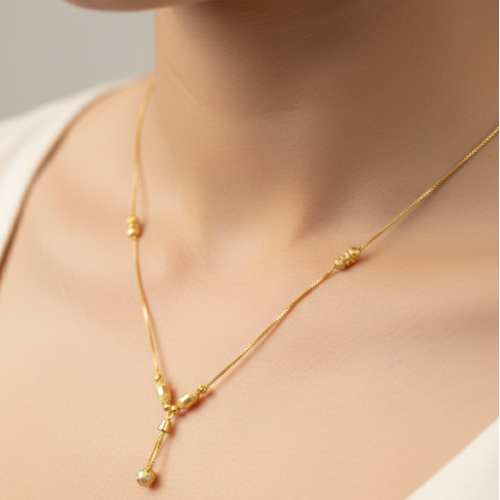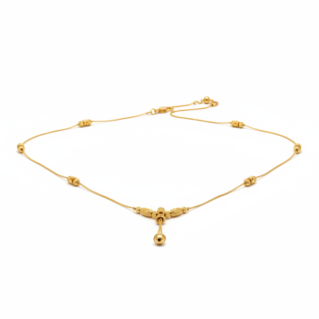 Enhance your jewelry collection today with our sleek and elegant gold chain featuring delicate bead accents and a central drop pendant. A true blend of tradition and modernity, this chain is sure to become your go-to accessory for any occasion.