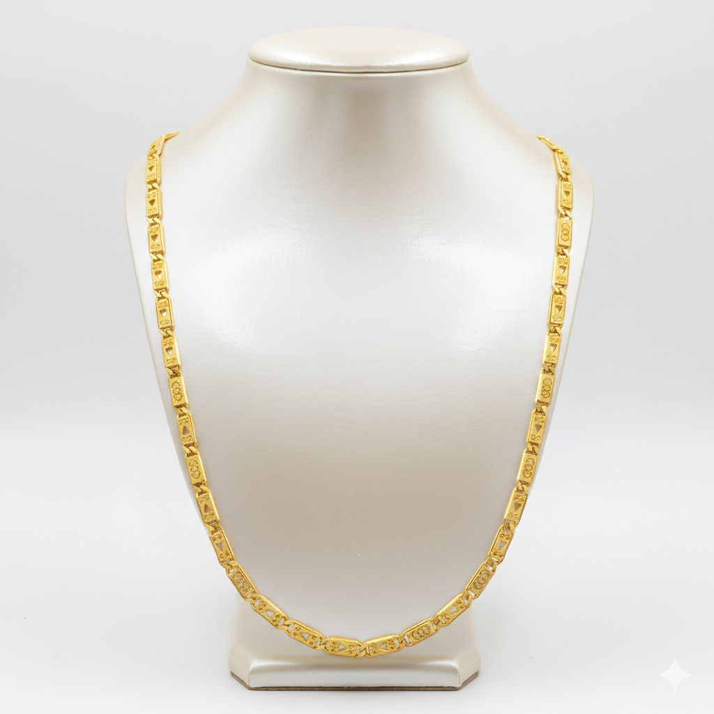 Our elegant gold chain necklace is meticulously designed, featuring sleek, rectangular links with subtle detailing that exudes sophistication. This piece is a perfect blend of timeless style and modern charm, crafted to enhance any outfit effortlessly. Whether worn as a standalone statement or layered with other jewelry, this necklace is versatile and refined.
