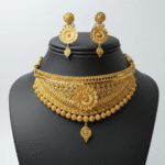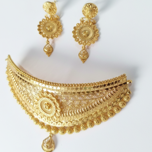 Elevate your ensemble with this luxurious gold-tone choker necklace set, crafted with intricate traditional detailing that embodies sophistication and charm. Designed to be the centerpiece of your look, this statement jewelry stands out at weddings, parties, and festive celebrations. Its flawless finish and ornate design make it an essential addition to your collection, creating unforgettable moments every time you wear it.