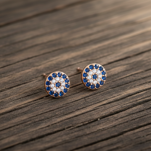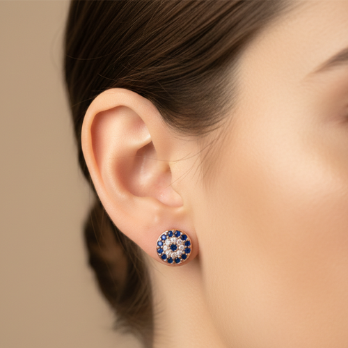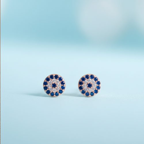 Each earring showcases a concentric ring pattern paved with alternating blue and clear gemstones. The harmonious combination of colors complements the protective ‘Evil Eye’ motif, known for its ability to ward off negativity while adding a refined pop of color to your look. The gemstones are meticulously set, ensuring a radiant finish that catches the light beautifully with every movement.