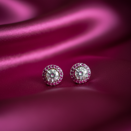 Experience the epitome of sophistication and sparkle with our captivating halo stud earrings. Designed to radiate timeless beauty, these striking earrings feature a brilliant central diamond-like stone that exudes unmatched brilliance. Surrounding the centerpiece, a halo of vibrant pink or ruby-red accent stones adds a stunning pop of color to the overall design. Whether you’re stepping into a formal gathering or looking to elevate your everyday style, these earrings are the perfect choice to make a lasting impression.
