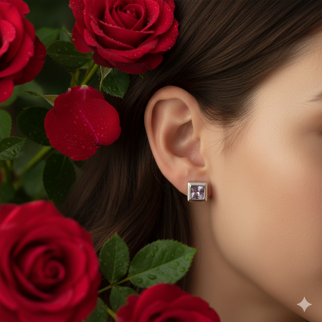 Step into sophistication with our stylish silver stud earrings, designed to bring a touch of modern elegance to your daily wardrobe. Featuring a sleek square-cut lavender stone at the center, these earrings are the perfect blend of understated beauty and refined charm. The subtle lavender hue adds a splash of color without overpowering your ensemble, making them ideal for everyday wear or special occasions.