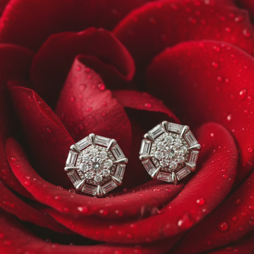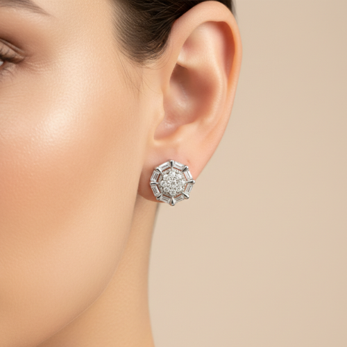 Crafted to offer both beauty and durability, these silver-toned studs are a statement of refined elegance. The precise arrangement of the radiant stones enhances their brilliance, making them striking yet understated. The octagon-floral design is a testament to modern craftsmanship paired with timeless aesthetics, ensuring these earrings stay in style year after year. Their lightweight construction provides comfort, allowing you to wear them effortlessly throughout the day or night.