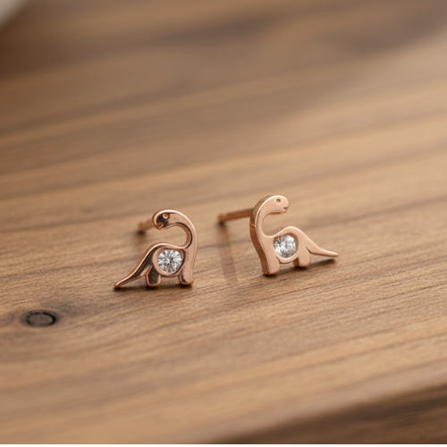 Enhance your everyday style with these charming dinosaur-shaped stud earrings. Crafted in a radiant rose-gold finish, they bring an irresistible touch of playfulness and elegance to your accessory collection. Whether you’re a jewelry enthusiast seeking something unique or a fan of minimalist designs, these earrings effortlessly blend fun and sophistication to suit all tastes.