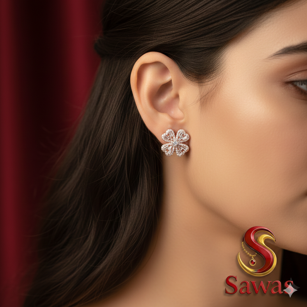 The Clover Studs exude charm and elegance with their unique rose gold-tone finish and intricate design. These studs feature a delicate four-leaf clover or heart-petal motif, seamlessly blending modern style with timeless symbolism. Each petal is meticulously outlined with small, clear stones and filled with radiant baguette-cut clear stones, creating a mesmerizing shimmer. Whether you’re dressing up for a special event or adding a touch of sophistication to your everyday look, the Clover Studs are the perfect accessory for elevating your style.