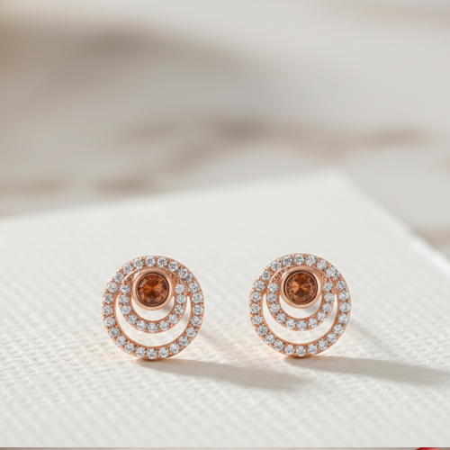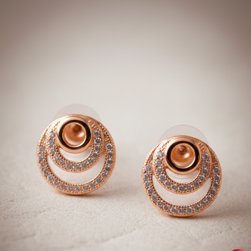 Timeless and versatile, the Concentric Circle Studs are crafted in a striking rose gold tone with a concentric circle design. The outer and middle circles are exquisitely lined with clear stones, while the polished rose gold center creates a harmonious balance of elegance and simplicity. These earrings suit any occasion, offering a refined yet modern aesthetic.