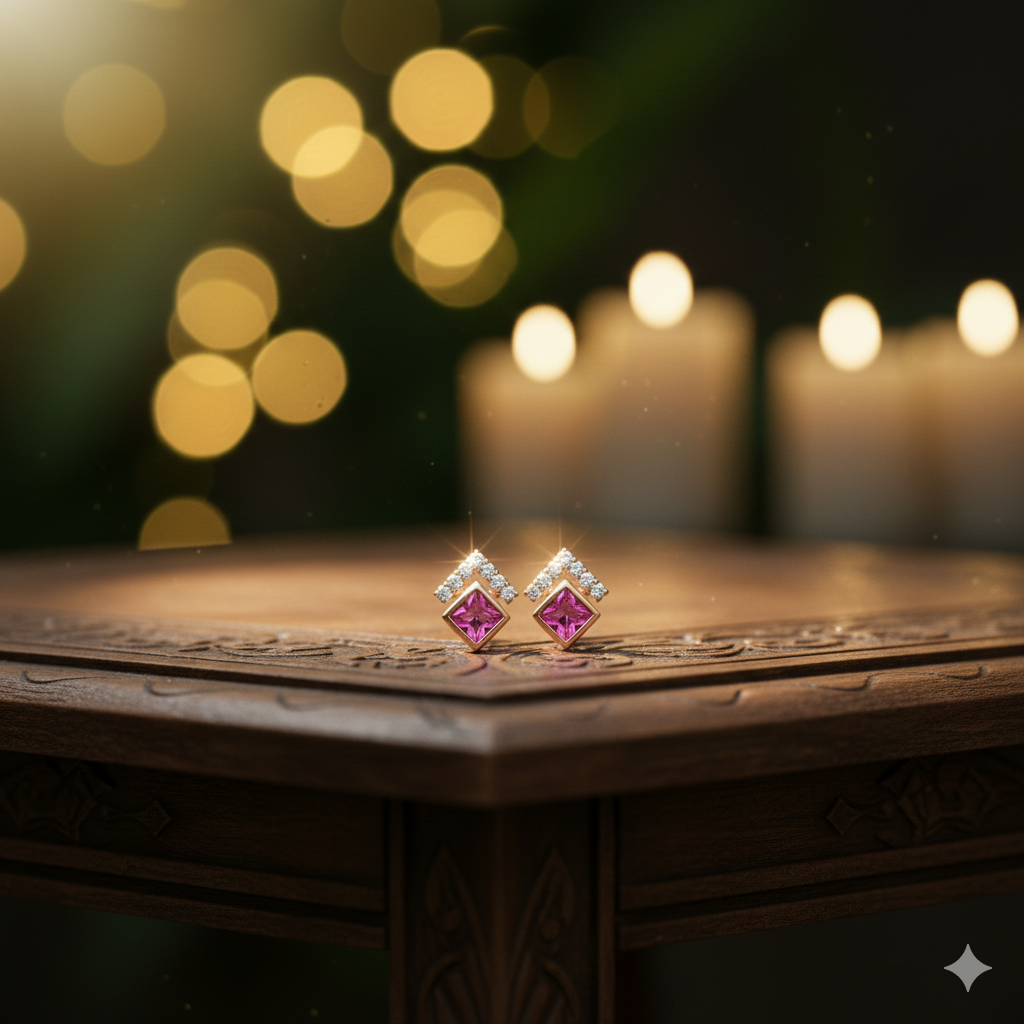 What sets these stud earrings apart is the sophisticated chevron or diagonal accent above the main stone. Adorned with pavé-set small clear diamonds or stones, the design enhances the overall brilliance, adding a touch of glamour. Every detail—from the precise gemstone cut to the impeccable placement of each accent stone—reflects meticulous craftsmanship. The rose gold complements the vivid pink gem, creating a harmonious interplay of colors and textures that appeal to modern jewelry aficionados.