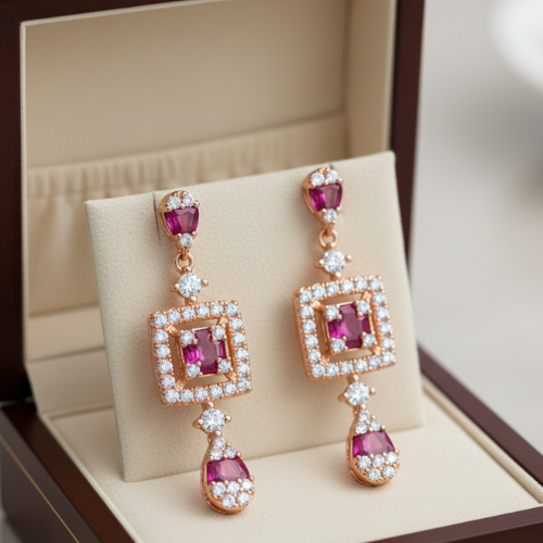 Elevate your accessory collection with these exquisite rose gold-plated dangle earrings. With their stunning craftsmanship and luxurious materials, these earrings are designed to make a lasting impression. The vibrant magenta and ruby-colored stones pair seamlessly with the sparkling white cubic zirconia adornments, creating a captivating blend of glamour and sophistication. Perfect for those who love to mix timeless elegance with a modern touch.