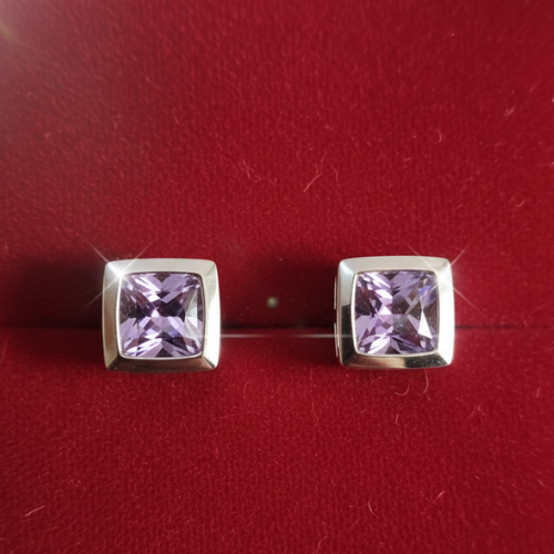 These stud earrings are crafted with attention to detail and durability. The delicate square-cut lavender gemstone is expertly chosen for its vibrant yet soothing color, radiating grace and refinement. The secure bezel setting provides a protective yet stylish frame, ensuring longevity and comfort for everyday wear. Made from high-quality white metal, such as silver or white gold, the earrings exhibit a lustrous finish that complements the gem’s brilliance perfectly. They are a testament to timeless beauty and superior artistry.