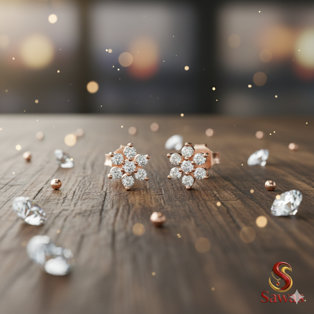 Each pair of these flower-shaped stud earrings is crafted to perfection, ensuring that every detail reflects the highest standards of quality. The shimmering diamonds, set against the soft, blush hue of rose gold, create a radiant and elegant appearance. Whether you’re dressing up for a formal event or adding charm to your casual attire, these earrings complement any wardrobe effortlessly.