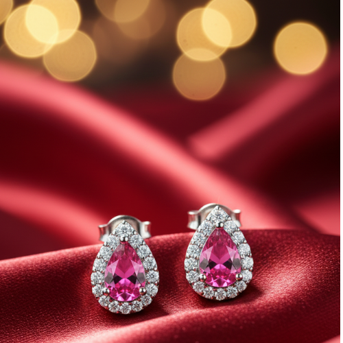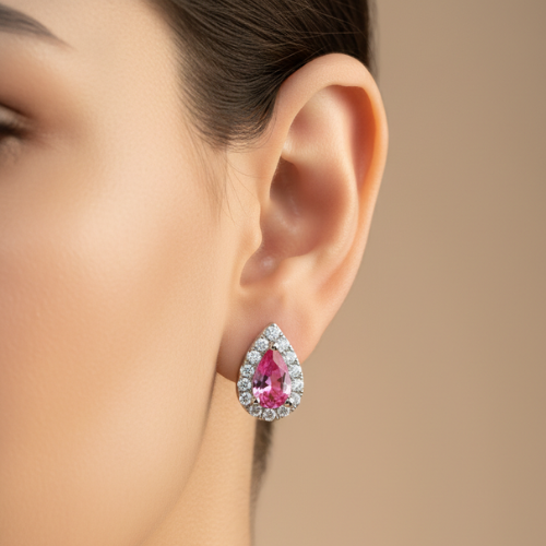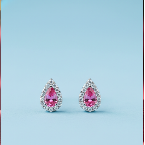 These teardrop stud earrings are crafted to perfection, offering an exquisite design that blends timeless aesthetics with modern appeal. At the center of these stunning earrings lies a vibrant pink gemstone, radiating warmth and charm. Encased in a sparkling halo of clear stones, the earrings are designed to bring out the best in every outfit, whether it’s your everyday look or a special ensemble for an important event.