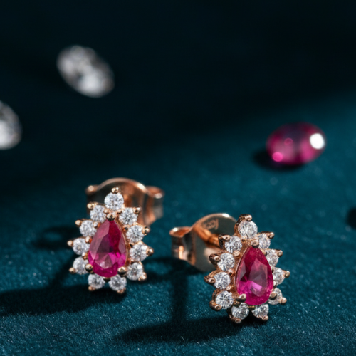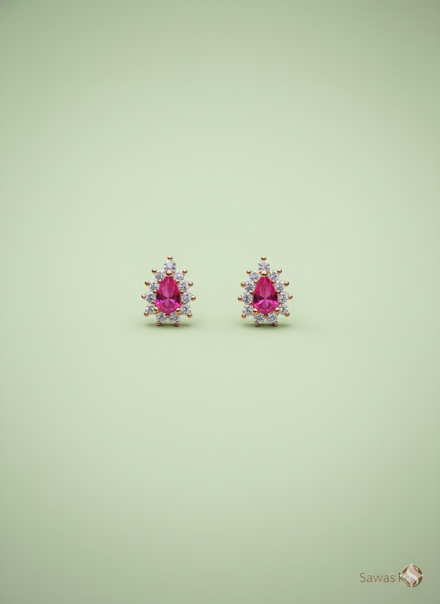 Enhance your jewelry collection with these dazzling stud earrings featuring a vibrant pink teardrop gemstone. Surrounded by a sparkling cluster of white stones, the earrings are meticulously crafted in a delicate gold setting that complements their sophisticated design. Whether for a casual outing or a glamorous event, these earrings are the perfect finishing touch to elevate your style.