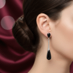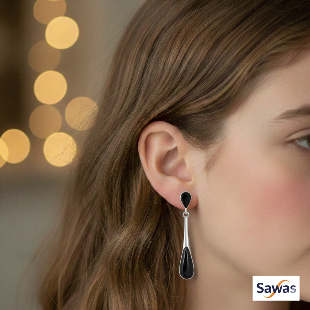 Each earring features a captivating combination of elements to create a truly exquisite accessory. The design begins with a small, round stone stud that anchors the piece securely, leading to a delicate chain that gently suspends a teardrop-shaped frame. This design achieves the perfect balance between modern trends and classic beauty, making it an ideal addition to your jewelry collection.