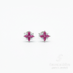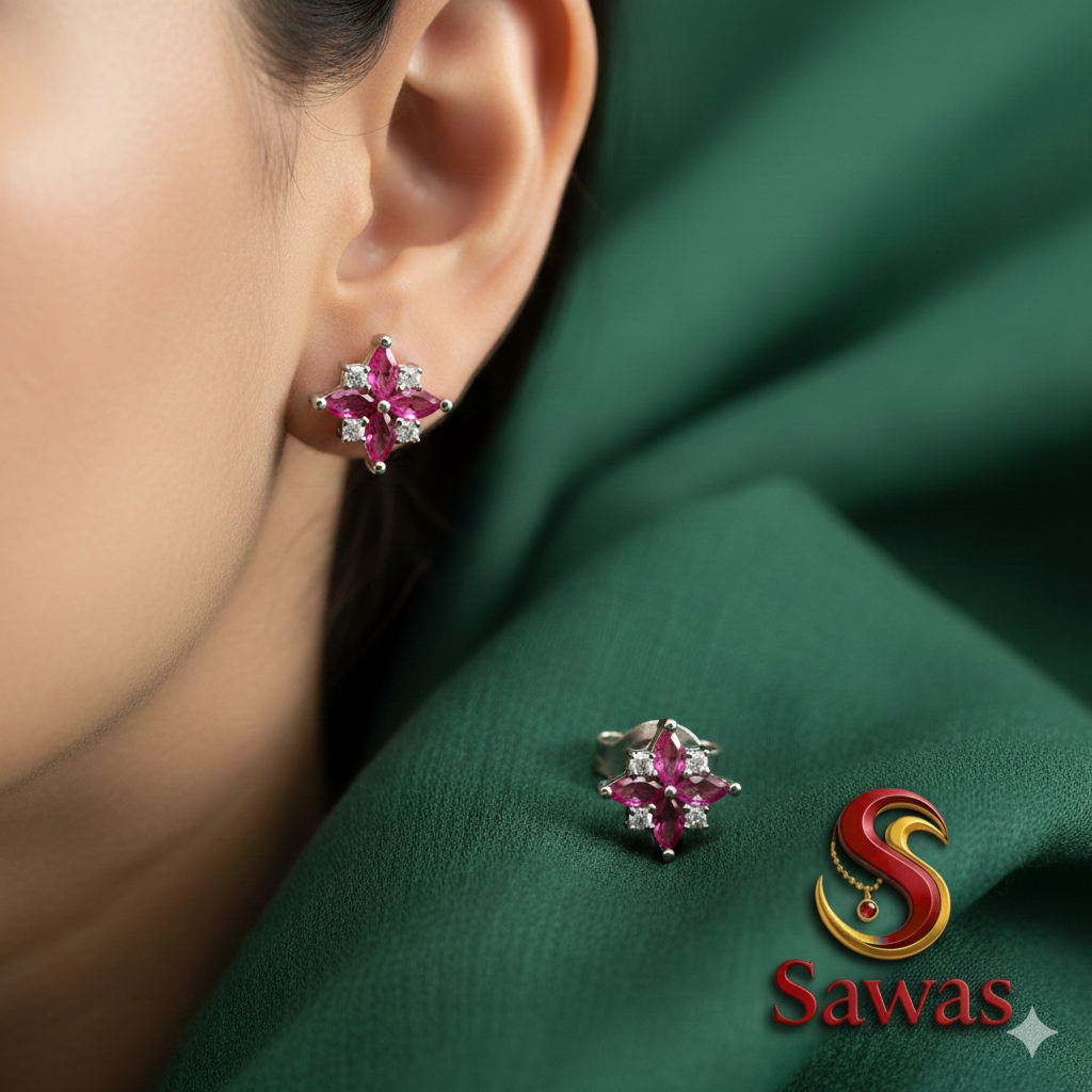 At the heart of these earrings lies a breathtaking display of four marquise-cut stones in vibrant magenta or rich ruby shades. The exquisite blend of color creates a striking centerpiece, reminiscent of a floral bloom or a starburst pattern. Adding to the beauty are delicate accents of sparkling white cubic zirconia stones nestled between the petals, which enhance the design with a refined touch of brilliance.