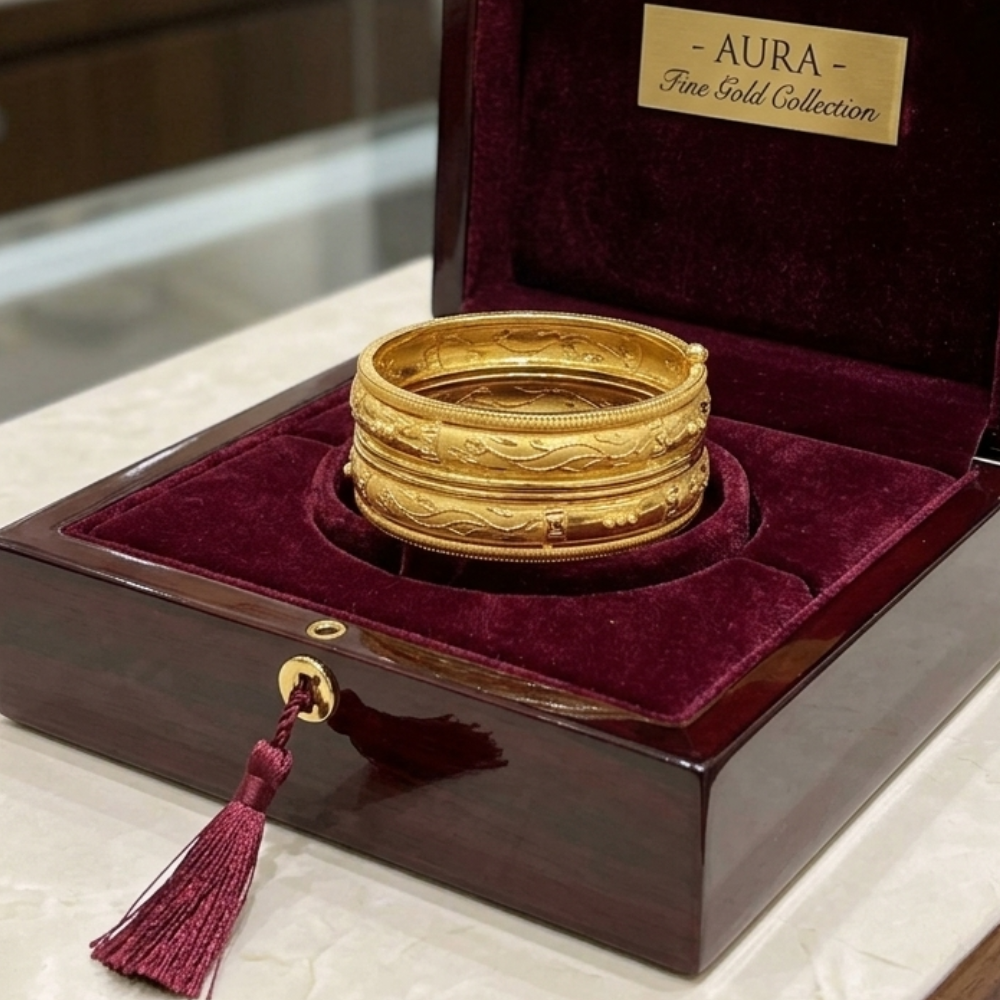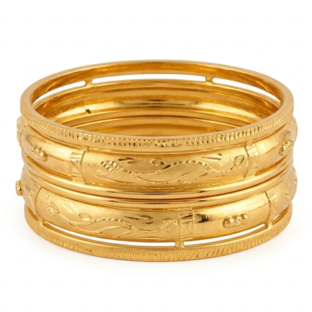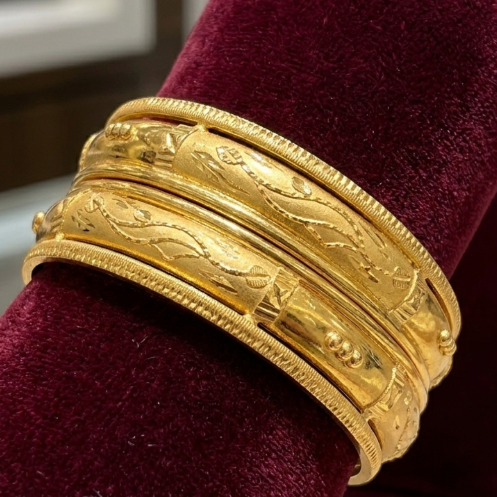 Finished in a rich yellow gold with a high-shine polish, these bangles radiate luxury, beautifully highlighting the intricate high-relief carvings. Perfect for formal events or daily wear, they’re the ultimate accessory for making a sophisticated statement.