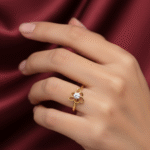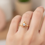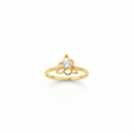 Crafted with premium yellow gold, this ring embodies lasting durability without sacrificing its light and feminine aesthetic. At its heart, a single, round, brilliant white stone—whether it’s a dazzling diamond or radiant cubic zirconia—sits securely within the flower cluster. This touch of sparkle ensures the ring catches the eye and complements the wearer harmoniously. The thin and plain band accentuates the floral centerpiece, drawing focus to its intricate details while maintaining a subtle elegance.